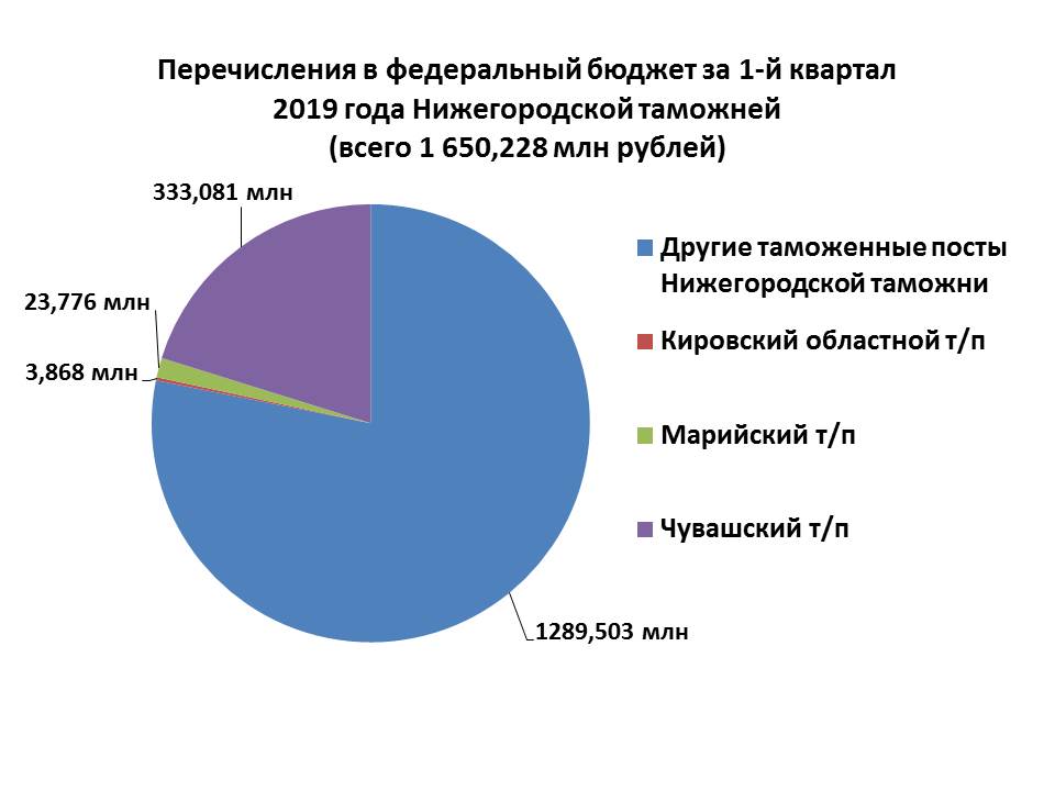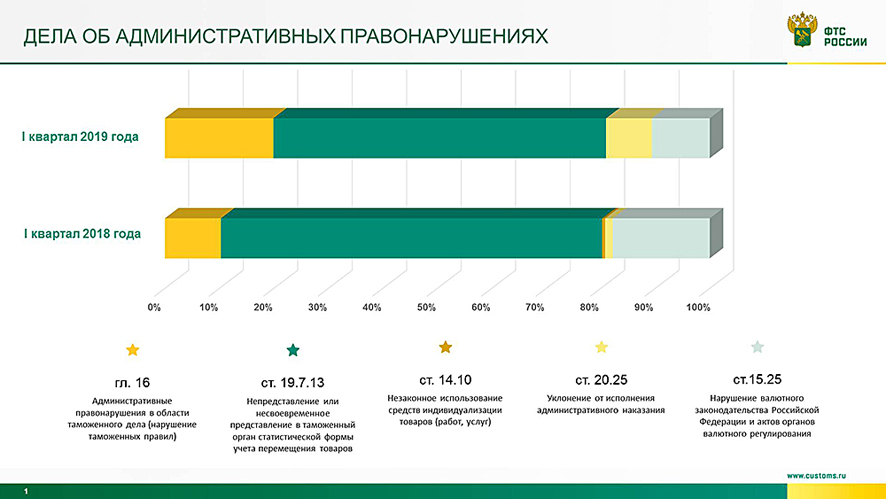 Всего в 1 квартале 2019 года подразделениями таможенного контроля после выпуска товаров проверено 418 юридических лиц, в деятельности которых выявлено более 2 тыс. нарушений. Возбуждено 1345 дел об АП и 53 уголовных дела. В федеральный бюджет перечислено 1,3 млрд руб. таможенных платежей, пеней, штрафов.