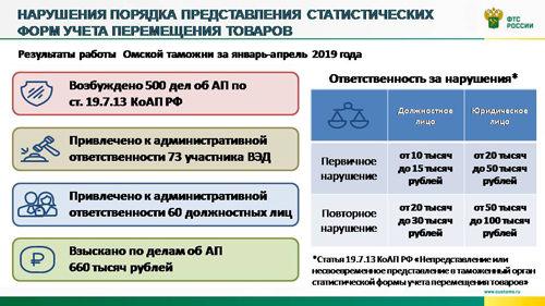 В соответствии со статьей 19.7.13 КоАП России непредставление или несвоевременное представление в таможенный орган статистической формы учета перемещения товаров либо представление статформы, содержащей недостоверные сведения, влечет наложение административного штрафа на должностных лиц в размере от 10 до 15 тысяч рублей; на юридических лиц – от 20 до 50 тысяч рублей.