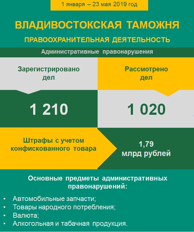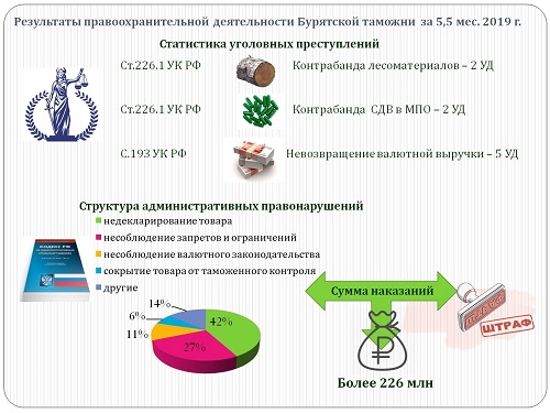 В отношении юридических, физических лиц и индивидуальных предпринимателей за 5 месяцев 2019 года было проведено 379 проверочных мероприятий (за аналогичный период 2018 года – 187). В перечень основных направлений таможенных проверок вошли: контроль достоверности заявления таможенной стоимости; проверки в отношении объектов интеллектуальной собственности при обороте товаров, ввезенных на таможенную территорию Евразийского экономического союза; контроль достоверности заявления кода товара в соответствии с Товарной номенклатурой внешнеэкономической деятельности Евразийского экономического союза. С начала года было взыскано 35,5 миллионов рублей, возбуждено 2 уголовных дела и 41 – об административных правонарушениях.