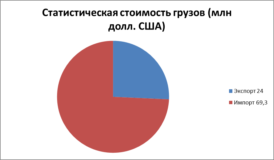 Совершены таможенные операции в отношении 1 940,25 тысяч тонн грузов стоимостью 755 млн долл. США (в 1 полугодии 2017 году – 1 971 тысяч тонн, 674 млн долл. США). По сравнению с 1 полугодием 2017 года грузооборот снизился на 1,6 %, в стоимостном выражении вырос на 11,8%.