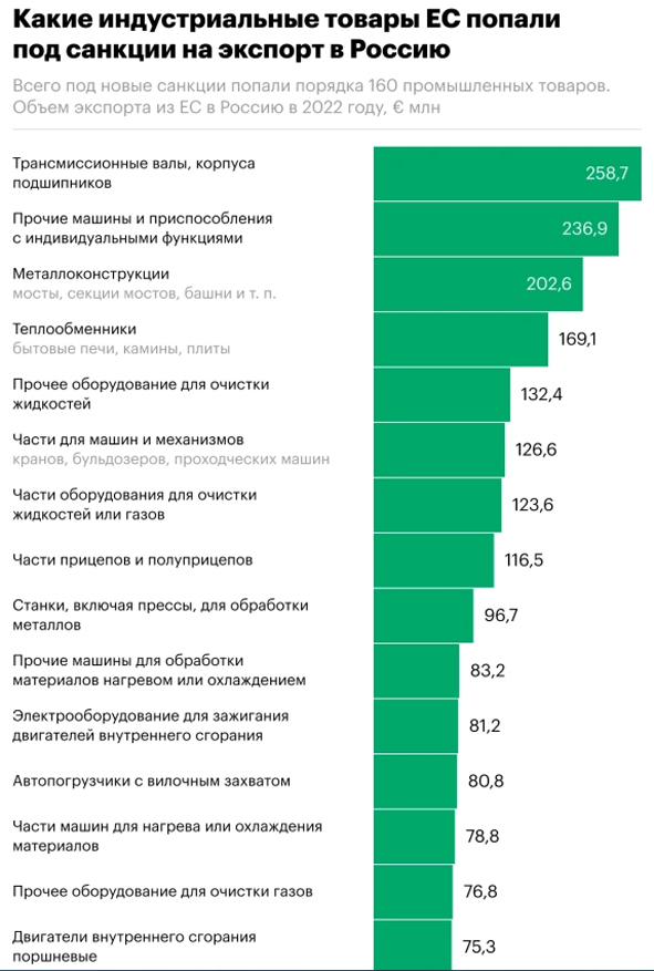 В рамках десятого пакета антироссийских санкций Евросоюз запретил экспорт в Россию множества промышленных товаров — всего более 200 таможенных кодов. В Еврокомиссии заявили, что новые ограничения затрагивают продукцию, поставки которой в Россию в 2021 году составляли €11,4 млрд. В ходе предыдущих санкционных раундов ЕС ограничил экспорт товаров на €32,5 млрд (по данным за 2021 год).